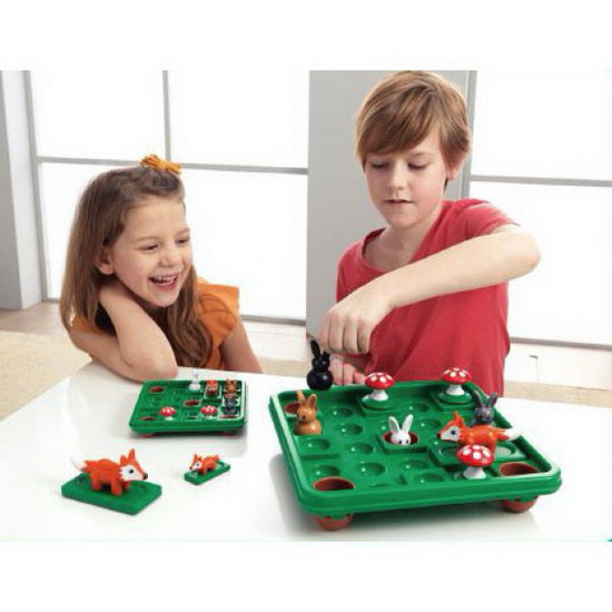 Choisissez un défi et placez les lièvres, renards et champignons sur le plan comme indiqué. Le but du jeu consiste à déplacer les lièvres (en bondissant) et les renards (en glissant) sur le plan de jeu jusqu'à ce qu les lièvres soient en sécurité dans les trous marrons.